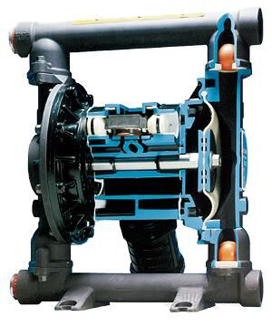 氣動(dòng)雙隔膜泵采用壓縮空氣、氮?dú)饣蛱烊粴庾鳛閯?dòng)力。主定向(氣動(dòng))控制閥將壓縮空氣分配至氣體腔室,向隔膜的內(nèi)表面上施加均勻壓力。同時(shí)排出的氣體從泵另一側(cè)后方通過氣閥組件導(dǎo)向端口排出。